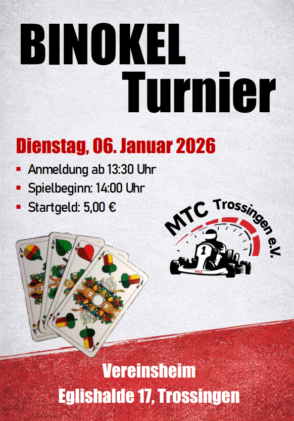 In diesem Jahr findet das Binokel-Turnier wieder beim MTC Trossingen statt. Spielbeginn ist um 14:00 Uhr. Bereits ab 13:30 Uhr können sich die Teilnehmer bei der Spielleitung anmelden.